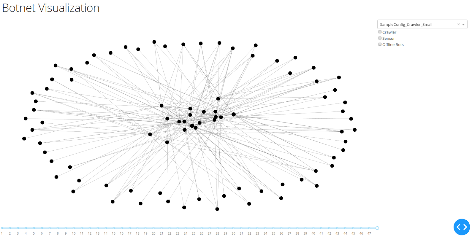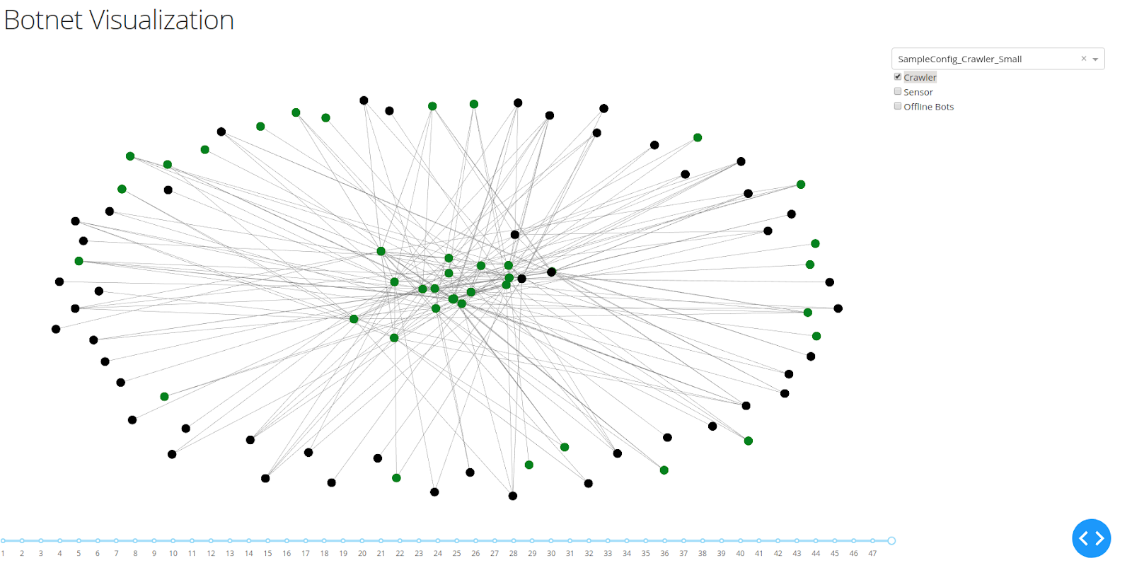 The dropdown menu in the top right of the screen allows you to choose between the results of different configurations. On the bottom of the screen you can see a timeline indicating all available snapshots of the botnet. This allows to visualize changes in the activity and connectivity of the bots. Furthermore, the menu on the right allows to visualize the information collected by crawlers or sensors. An example can be seen in the following figure, where the view of the crawler is highlighted in green.