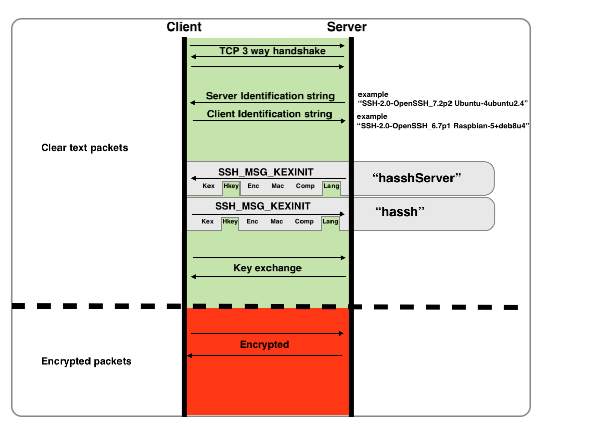 “hassh” and “hasshServer” are MD5 hashes constructed from a specific set of algorithms that are supported by various SSH Client and Server Applications. These algorithms are exchanged after the initial TCP three-way handshake as clear-text packets known as “SSH_MSG_KEXINIT” messages, and are an integral part of the setup of the final encrypted SSH channel. The existence and ordering of these algorithms is unique enough such that it can be used as a fingerprint to help identify the underlying Client and Server application or unique implementation, regardless of higher level ostensible identifiers such as “Client” or “Server” strings.