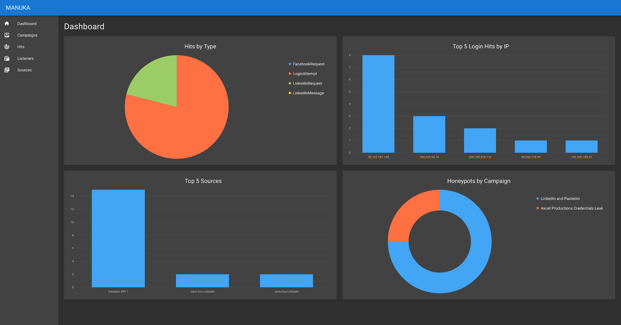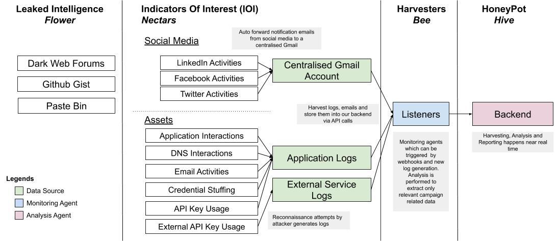 - Honeypots: Groups of sources and listeners that are organized into a single Campaign which analyzes and tracks hits over time.