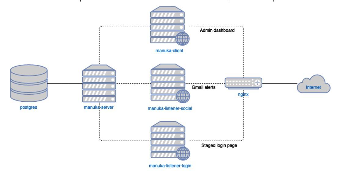 - manuka-server: Central Golang server that performs CRUD operations and ingests hits from listeners.