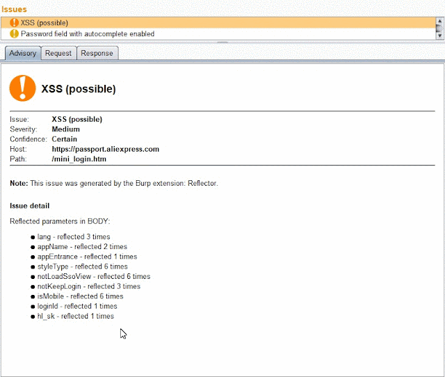Each burp issue includes detailed info about reflected parameter, such as: