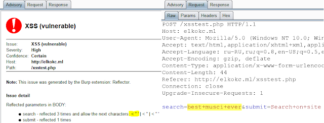 When the reflection is found and option “Aggressive mode” is activated, the reflector will check which of special-symbols are displayed on this page from vulnerable parameters. For this action, reflector compose additional requests for each reflected parameter. In example, while we was working with elkokc.ml website reflector are generated issue with a detailed information about reflection. There are 3 reflection for “search” parameter and each of them pass special symbols. Because of the possibility of displaying special characters issue severity is marked as high. Every time when reflection is found reflector define severity and generate burp issue.