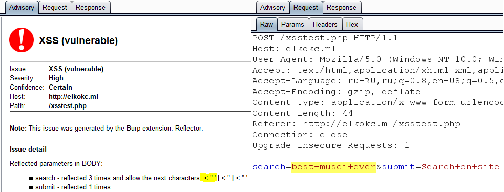 When the reflection is found and option “Aggressive mode” is activated, the reflector will check which of special-symbols are displayed on this page from vulnerable parameters. For this action, reflector compose additional requests for each reflected parameter. In example, while we was working with elkokc.ml website reflector are generated issue with a detailed information about reflection. There are 3 reflection for “search” parameter and each of them pass special symbols. Because of the possibility of displaying special characters issue severity is marked as high. Every time when reflection is found reflector define severity and generate burp issue.