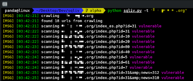 python sqliv.py -d "inurl:index.php?id=" -e google