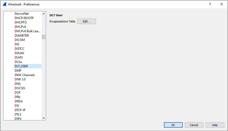 Currently, you have to ask Wireshark to interpret the DLT_USER 147 as ETW. This is because you have not yet a true value from libpcap for our new Data Link. We issued a pull request to have a dedicated DLT value; it is still pending. To do that you have to open Preferences tab under the Edit panel. Select DLT_USER under Protocols and Edit the encapsulations table:
